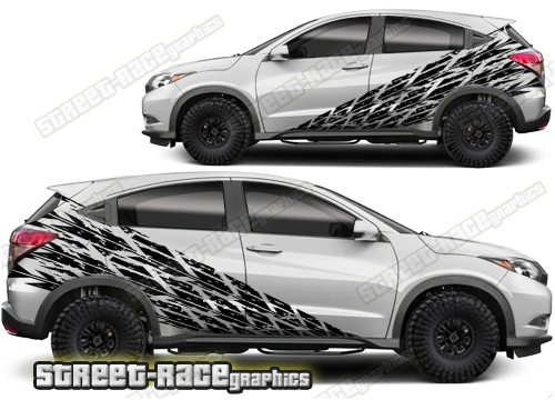 Honda HR-V graphics. They are shown on the second generation HR-V but they can be trimmed to fit all later versions and facelift variants. The decals are not pre-cut for any specific Honda HR-V version; they do not have any door handle cutouts, wheel arch or door line splits. These will require trimming during fitting. Vinyl will not stick to unpainted textured plastics.