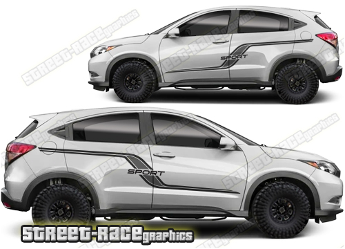 Honda HR-V graphics. They are shown on the second generation HR-V but they can be trimmed to fit all later versions and facelift variants. The decals are not pre-cut for any specific Honda HR-V version; they do not have any door handle cutouts, wheel arch or door line splits. These will require trimming during fitting. Vinyl will not stick to unpainted textured plastics.