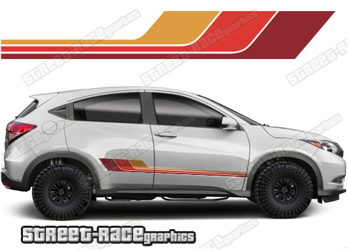 Honda HR-V racing stripes. They are shown on the second generation HR-V but they can be trimmed to fit all later versions and facelift variants. The decals are not pre-cut for any specific Honda HR-V version; they do not have any door handle cutouts, wheel arch or door line splits. These will require trimming during fitting. Vinyl will not stick to unpainted textured plastics.