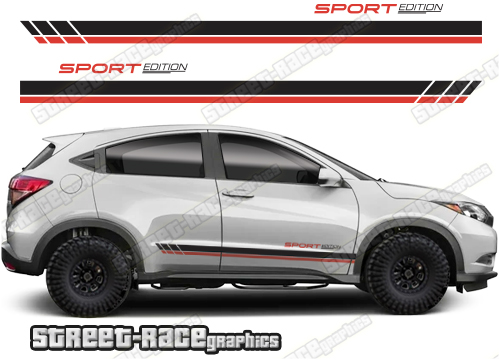 Honda HR-V racing stripes. They are shown on the second generation HR-V but they can be trimmed to fit all later versions and facelift variants. The decals are not pre-cut for any specific Honda HR-V version; they do not have any door handle cutouts, wheel arch or door line splits. These will require trimming during fitting. Vinyl will not stick to unpainted textured plastics.