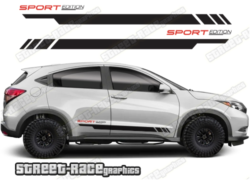 Honda HR-V racing stripes. They are shown on the second generation HR-V but they can be trimmed to fit all later versions and facelift variants. The decals are not pre-cut for any specific Honda HR-V version; they do not have any door handle cutouts, wheel arch or door line splits. These will require trimming during fitting. Vinyl will not stick to unpainted textured plastics.