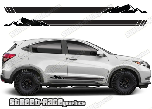 Honda HR-V racing stripes. They are shown on the second generation HR-V but they can be trimmed to fit all later versions and facelift variants. The decals are not pre-cut for any specific Honda HR-V version; they do not have any door handle cutouts, wheel arch or door line splits. These will require trimming during fitting. Vinyl will not stick to unpainted textured plastics.