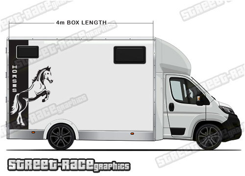 Horsebox Graphics: Enhance the visual appeal of your existing horsebox, horse transporter, or trailer with our dynamic graphics. The illustrations showcase the graphics integrated onto a Luton low loader featuring a 4m long box.