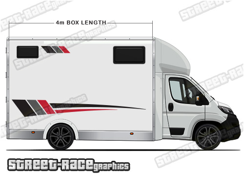 Horsebox Graphics: Enhance the visual appeal of your existing horsebox, horse transporter, or trailer with our dynamic graphics. The illustrations showcase the graphics integrated onto a Luton low loader featuring a 4m long box.
