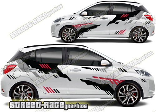 Hyundai Grand i10 large graphics. They are a universal fit to suit all Hyundai Grand i10 cars and facelift variants. There are no cutouts for the door handles, wheel arches or door lines; these will require trimming during fitting.