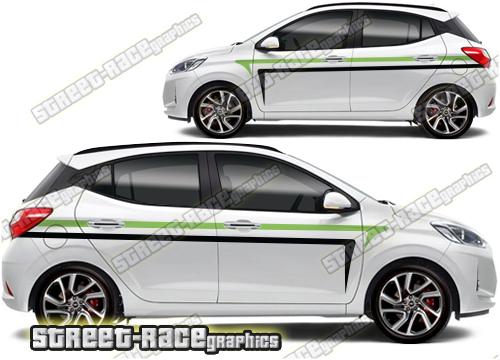 Hyundai Grand i10 large graphics. They are a universal fit to suit all Hyundai Grand i10 cars and facelift variants. There are no cutouts for the door handles, wheel arches or door lines; these will require trimming during fitting.