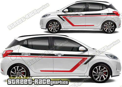 Hyundai Grand i10 large graphics. They are a universal fit to suit all Hyundai Grand i10 cars and facelift variants. There are no cutouts for the door handles, wheel arches or door lines; these will require trimming during fitting.