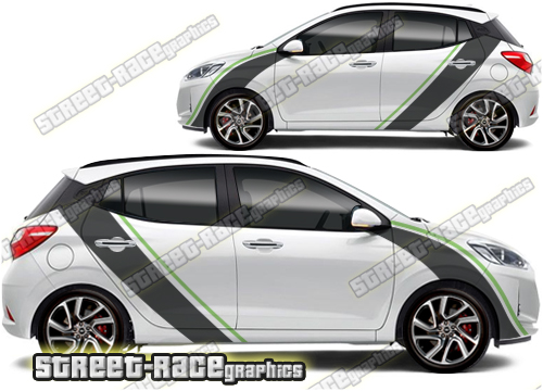 Hyundai Grand i10 large graphics. They are a universal fit to suit all Hyundai Grand i10 cars and facelift variants. There are no cutouts for the door handles, wheel arches or door lines; these will require trimming during fitting.