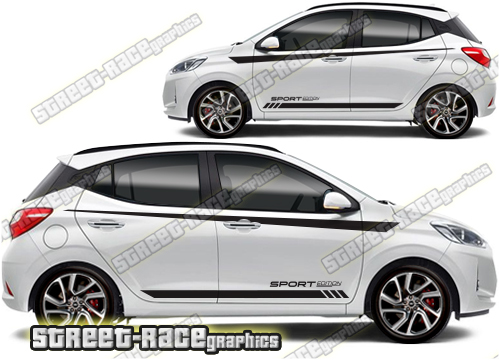 Hyundai Grand i10 large graphics. They are a universal fit to suit all Hyundai Grand i10 cars and facelift variants. There are no cutouts for the door handles, wheel arches or door lines; these will require trimming during fitting.