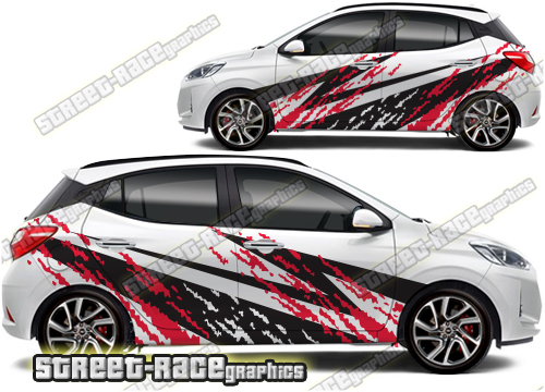 Hyundai Grand i10 large graphics. They are a universal fit to suit all Hyundai Grand i10 cars and facelift variants. There are no cutouts for the door handles, wheel arches or door lines; these will require trimming during fitting.