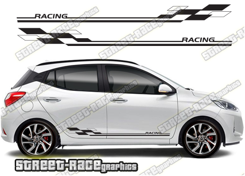 Hyundai Grand i10 racing stripes. They are a universal fit to suit all Hyundai Grand i10 cars and facelift variants. There are no cutouts for the wheel arches or door lines; these will require trimming during fitting.