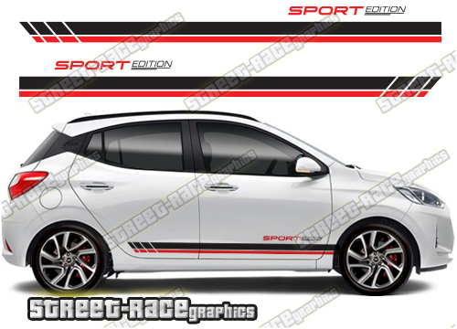 Hyundai Grand i10 racing stripes. They are a universal fit to suit all Hyundai Grand i10 cars and facelift variants. There are no cutouts for the wheel arches or door lines; these will require trimming during fitting.