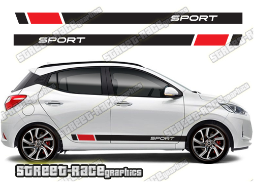 Hyundai Grand i10 racing stripes. They are a universal fit to suit all Hyundai Grand i10 cars and facelift variants. There are no cutouts for the wheel arches or door lines; these will require trimming during fitting.