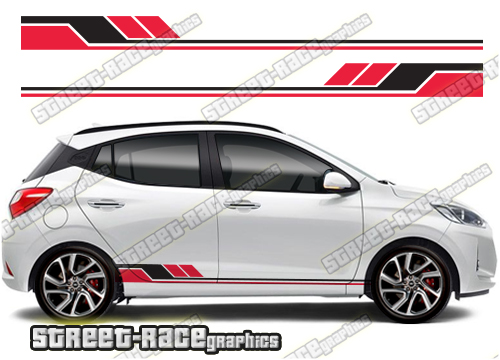 Hyundai Grand i10 racing stripes. They are a universal fit to suit all Hyundai Grand i10 cars and facelift variants. There are no cutouts for the wheel arches or door lines; these will require trimming during fitting.