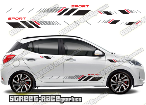Hyundai Grand i10 racing stripes. They are a universal fit to suit all Hyundai Grand i10 cars and facelift variants. There are no cutouts for the wheel arches or door lines; these will require trimming during fitting.