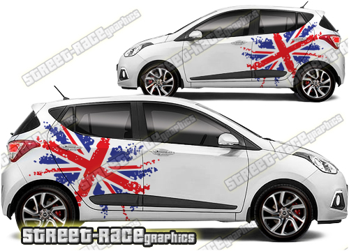 Hyundai i10 large graphics. They are a universal fit to suit all Hyundai i10 cars and facelift variants. There are no cutouts for the door handles, wheel arches or door lines; these will require trimming during fitting.