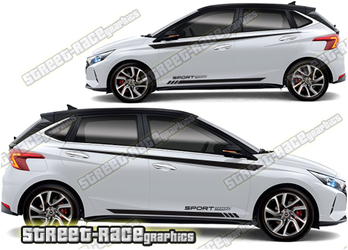 Hyundai i20 large graphics. They are a universal fit to suit all Hyundai i20 cars and facelift variants. There are no cutouts for the door handles, wheel arches or door lines; these will require trimming during fitting.