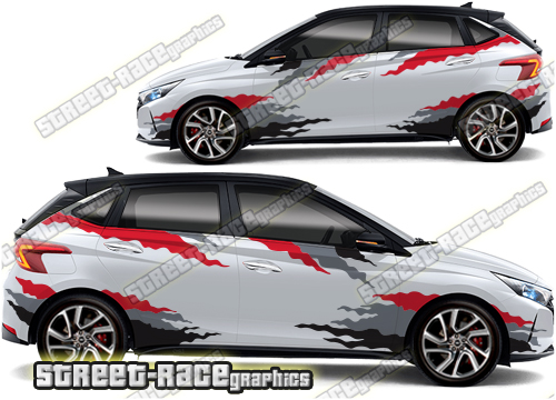 Hyundai i20 large graphics. They are a universal fit to suit all Hyundai i20 cars and facelift variants. There are no cutouts for the door handles, wheel arches or door lines; these will require trimming during fitting.