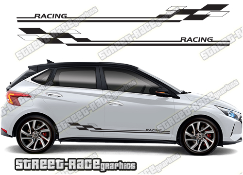 Hyundai i20 racing stripes. They are a universal fit to suit all Hyundai i20 cars and facelift variants. There are no cutouts for the wheel arches or door lines; these will require trimming during fitting.