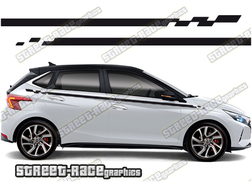 Hyundai i20 racing stripes. They are a universal fit to suit all Hyundai i20 cars and facelift variants. There are no cutouts for the wheel arches or door lines; these will require trimming during fitting.