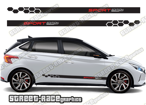 Hyundai i20 racing stripes. They are a universal fit to suit all Hyundai i20 cars and facelift variants. There are no cutouts for the wheel arches or door lines; these will require trimming during fitting.