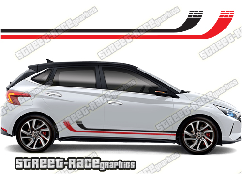 Hyundai i20 racing stripes. They are a universal fit to suit all Hyundai i20 cars and facelift variants. There are no cutouts for the wheel arches or door lines; these will require trimming during fitting.