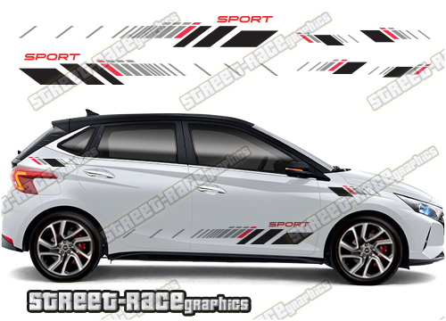 Hyundai i20 racing stripes. They are a universal fit to suit all Hyundai i20 cars and facelift variants. There are no cutouts for the wheel arches or door lines; these will require trimming during fitting.