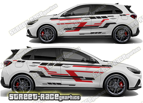 Hyundai i30 large graphics. They are a universal fit to suit all Hyundai i30 cars and facelift variants. There are no cutouts for the door handles, wheel arches or door lines; these will require trimming during fitting.