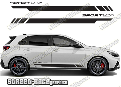 Hyundai i30 racing stripes. They are a universal fit to suit all Hyundai i30 cars and facelift variants. There are no cutouts for the wheel arches or door lines; these will require trimming during fitting.