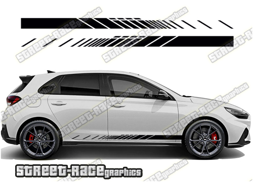 Hyundai i30 racing stripes. They are a universal fit to suit all Hyundai i30 cars and facelift variants. There are no cutouts for the wheel arches or door lines; these will require trimming during fitting.