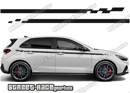 Hyundai i30 racing stripes. They are a universal fit to suit all Hyundai i30 cars and facelift variants. There are no cutouts for the wheel arches or door lines; these will require trimming during fitting.