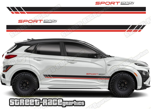 Hyundai Kona racing stripes. They are shown on the first generation Kona but they can be trimmed to fit all other versions and facelift variants. The decals are not pre-cut for any specific Kona version; they do not have any cutouts for the wheel arches or door line splits. These will require trimming during fitting. Vinyl will not stick to unpainted textured plastics.