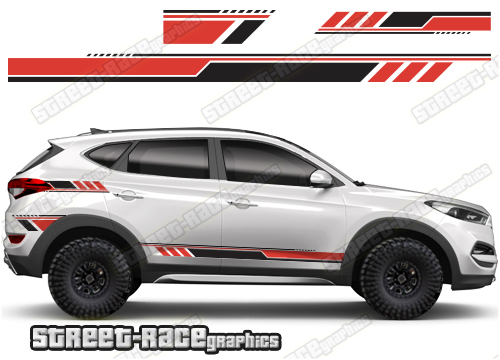 Hyundai Tuscon racing stripes (Also known as Hyundai ix35). They are shown on the third generation Tuscon but they can be trimmed to fit all other versions and facelift variants. The decals are not pre-cut for any specific Tuscon/ix35 version; they do not have any door handle cutouts, wheel arch or door line splits. These will require trimming during fitting. Vinyl will not stick to unpainted textured plastics.