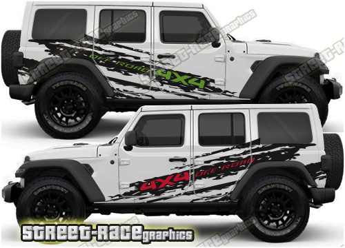 Jeep Wrangler rally raid style / overland large side stickers. These decals will fit all Wrangler 4 door 4×4 off-road truck variants.
