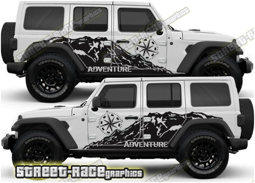 Jeep Wrangler rally raid style / overland large side stickers. These decals will fit all Wrangler 4 door 4×4 off-road truck variants.