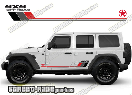 Jeep Wrangler side stickers. These decals will fit all Wrangler 4 door 4×4 off-road truck variants.