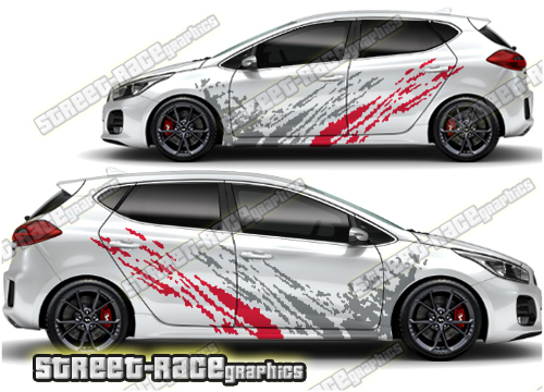 Kia Ceed large graphics. They are a universal fit to suit all Kia Ceed cars and facelift variants. There are no cutouts for the door handles, wheel arches or door lines; these will require trimming during fitting.