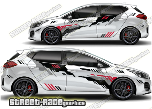 Kia Ceed large graphics. They are a universal fit to suit all Kia Ceed cars and facelift variants. There are no cutouts for the door handles, wheel arches or door lines; these will require trimming during fitting.