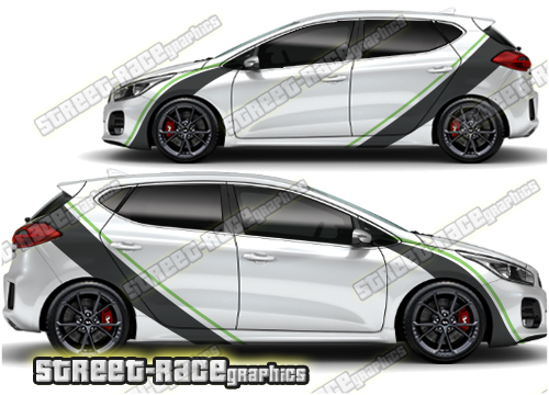 Kia Ceed large graphics. They are a universal fit to suit all Kia Ceed cars and facelift variants. There are no cutouts for the door handles, wheel arches or door lines; these will require trimming during fitting.