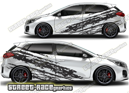 Kia Ceed large graphics. They are a universal fit to suit all Kia Ceed cars and facelift variants. There are no cutouts for the door handles, wheel arches or door lines; these will require trimming during fitting.