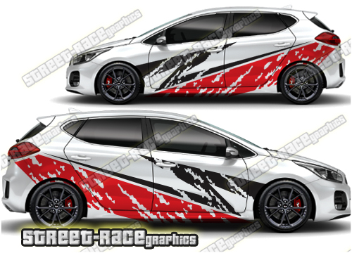 Kia Ceed large graphics. They are a universal fit to suit all Kia Ceed cars and facelift variants. There are no cutouts for the door handles, wheel arches or door lines; these will require trimming during fitting.