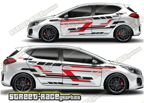 Kia Ceed large graphics. They are a universal fit to suit all Kia Ceed cars and facelift variants. There are no cutouts for the door handles, wheel arches or door lines; these will require trimming during fitting.