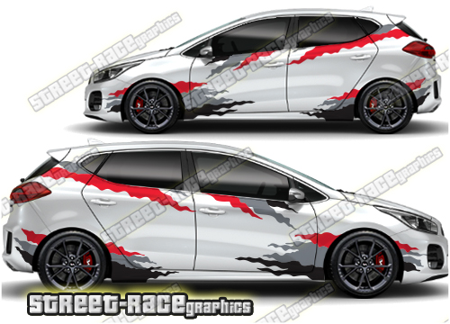 Kia Ceed large graphics. They are a universal fit to suit all Kia Ceed cars and facelift variants. There are no cutouts for the door handles, wheel arches or door lines; these will require trimming during fitting.