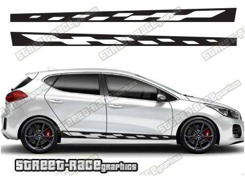 Kia Ceed racing stripes. They are a universal fit to suit all Kia Ceed cars and facelift variants. There are no cutouts for the wheel arches or door lines; these will require trimming during fitting.