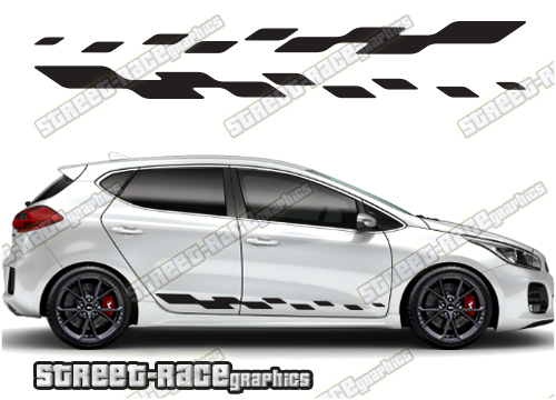 Kia Ceed racing stripes. They are a universal fit to suit all Kia Ceed cars and facelift variants. There are no cutouts for the wheel arches or door lines; these will require trimming during fitting.