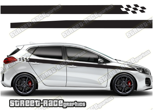 Kia Ceed racing stripes. They are a universal fit to suit all Kia Ceed cars and facelift variants. There are no cutouts for the wheel arches or door lines; these will require trimming during fitting.