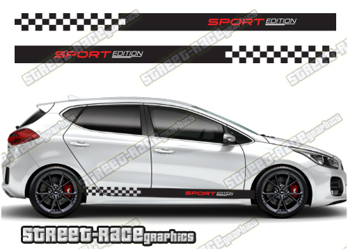 Kia Ceed racing stripes. They are a universal fit to suit all Kia Ceed cars and facelift variants. There are no cutouts for the wheel arches or door lines; these will require trimming during fitting.