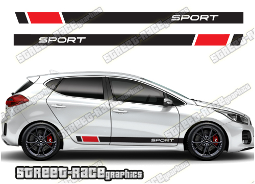 Kia Ceed racing stripes. They are a universal fit to suit all Kia Ceed cars and facelift variants. There are no cutouts for the wheel arches or door lines; these will require trimming during fitting.
