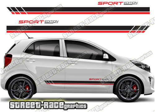 Kia Picanto racing stripes. They are a universal fit to suit all Kia Picanto cars and facelift variants. There are no cutouts for the wheel arches or door lines; these will require trimming during fitting.