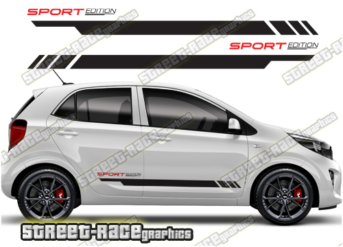 Kia Picanto racing stripes. They are a universal fit to suit all Kia Picanto cars and facelift variants. There are no cutouts for the wheel arches or door lines; these will require trimming during fitting.